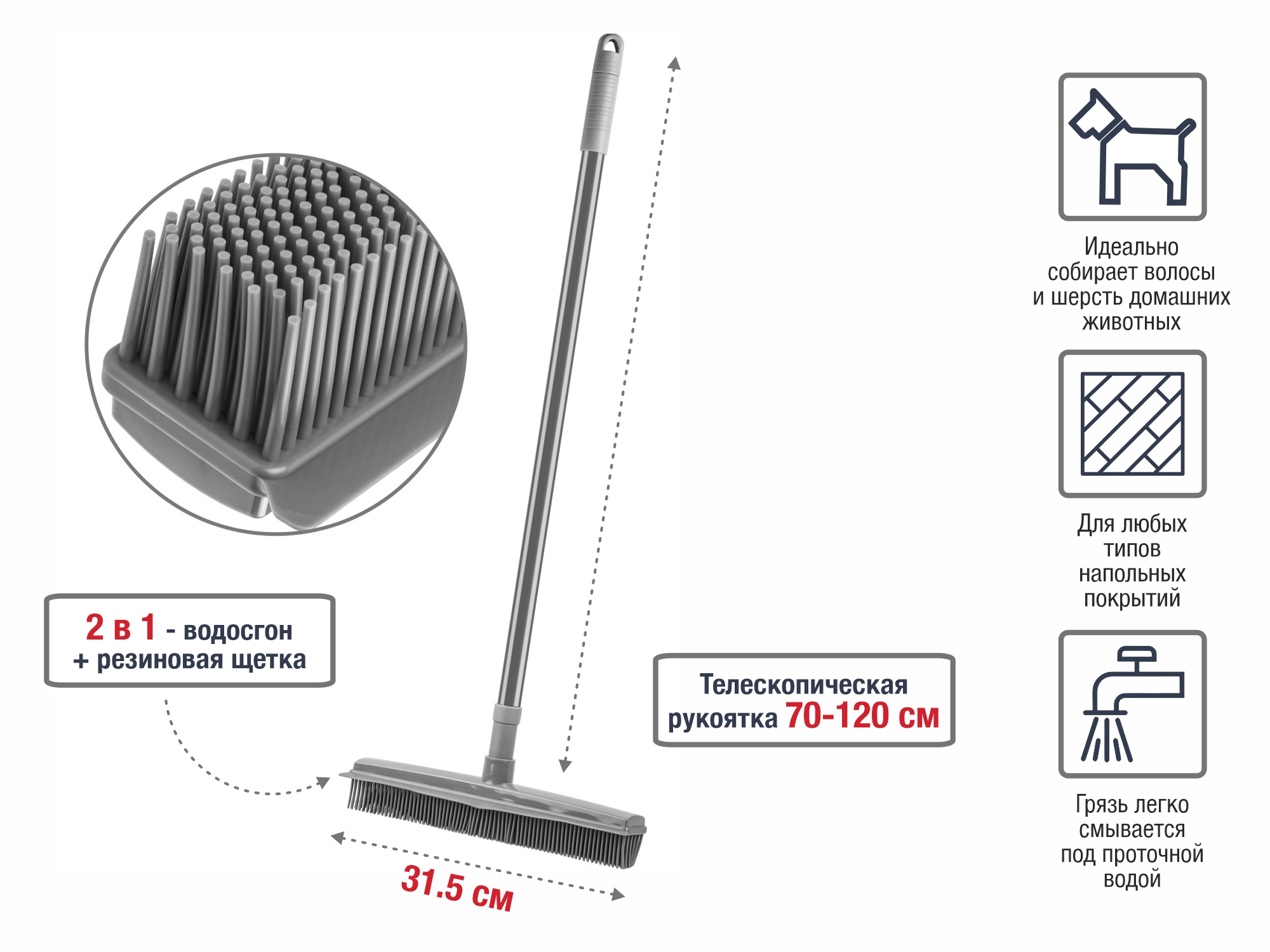 Универсальная щетка для пола, предназначена для уборки дома, двора, офиса и кухни. Щетка имеет телескопическую ручку размером от 70 до 120 см. Она имеет двустороннюю конструкцию с резиновой щетиной с одной стороны и водосгоном с другой.